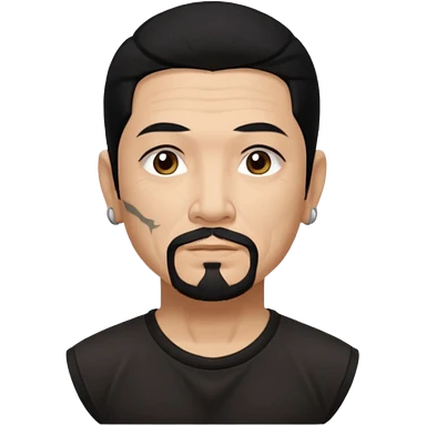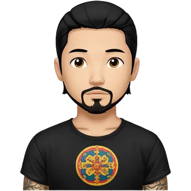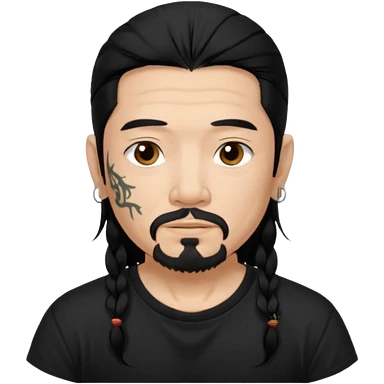 Spanish male. Asian eyes. Chin strap goatee. Untucked, loose fitting black t-shirt. long black hair. Even More tattoos. Peaceful emoji