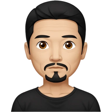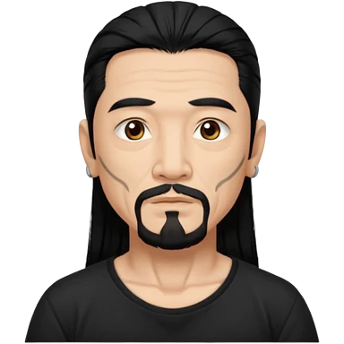 Older Spanish male. Asian eyes. Chin strap goatee. Untucked, loose fitting black t-shirt. long black hair. Even More tattoos. Peaceful emoji