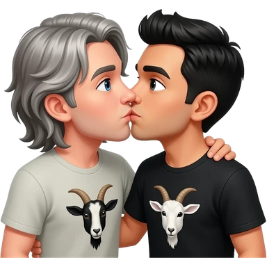 Two guys kissing passionately, one with a goat tee medium growth and gray hair and the other guy black hair with a black goat tee emoji