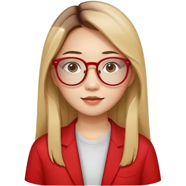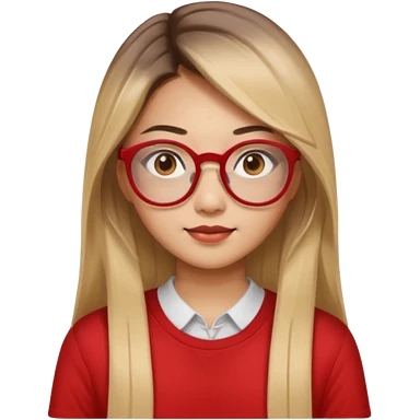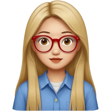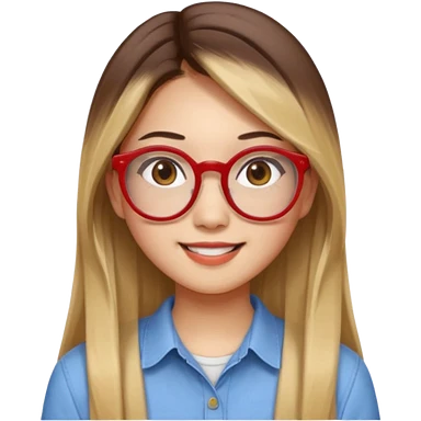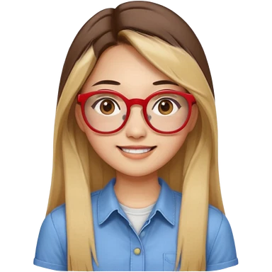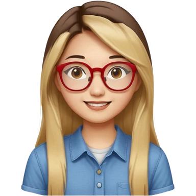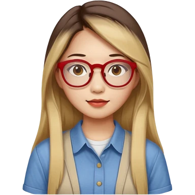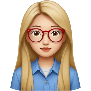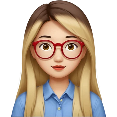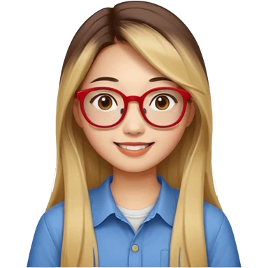20 yr old asian woman, straight thick long brown hair, blond at ends of hair, middle part, big red glasses, brown eyes, casual shirt emoji