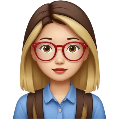 20 yr old asian woman, straight thick long brown hair, blond at tips of dark brown hair, center part to hair, big red glasses, brown eyes, casual shirt emoji