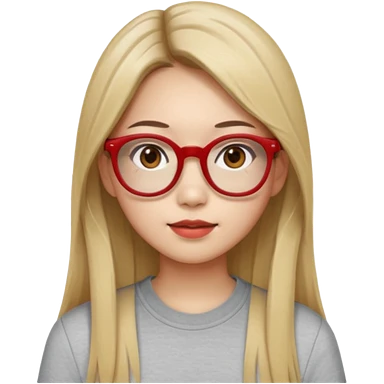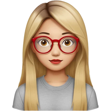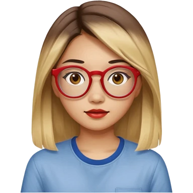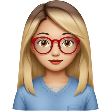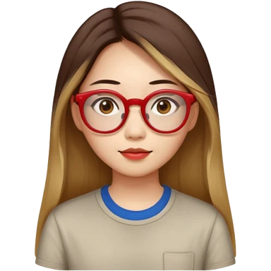 20 yr old asian woman, straight thick long brown hair, blond at ends of hair, center part to hair, big red glasses, brown eyes, casual shirt emoji