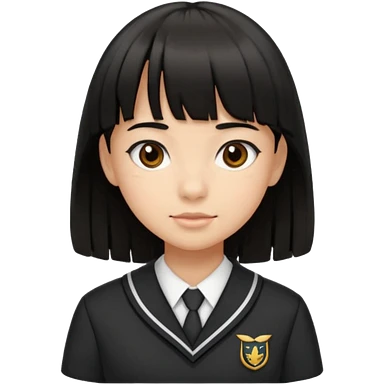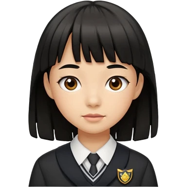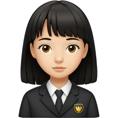 Asian woman in a chic school uniform, long black hair with straight bangs, and visible makeup emoji | AI Emoji Generator