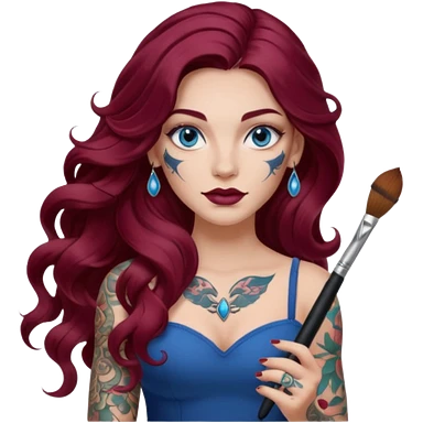 Female long wavy burgundy hair, blue eyes, large tattooed, artist with a makeup brush emoji