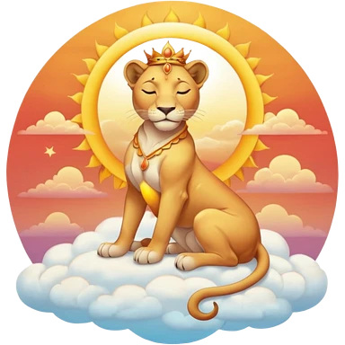 Sun-kissed Sunset-Gradient Celestial Flaring Warm Hot Feminine Beautiful Elegant Pretty Sun-Goddess-Lioness with closed relaxed eyes and symmetry and sitting on a cloud pastel divine dress beauty emoji
