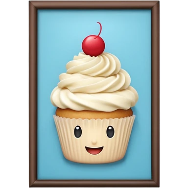 A 3D cartoon cupcake advertisement poster hanging on a wall, visible border, flat lighting, Memoji-style. emoji