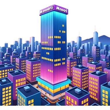 A 3D cartoon city billboard mounted on a tall building, glowing lights at dusk, realistic reflections, Memoji-style. emoji