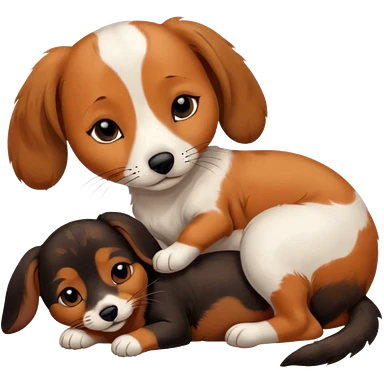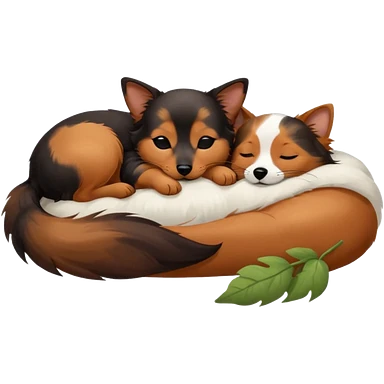Calico cat with black nose sleeping near a dachshund dog emoji