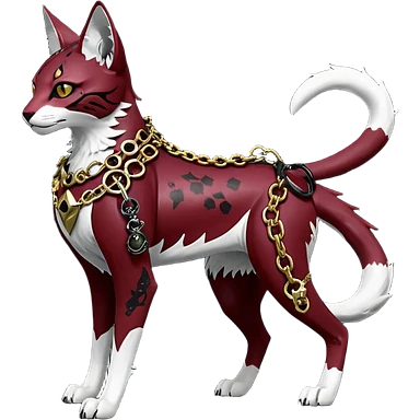 Epic complex knightly divine glorious futuristic detailed dark dusky gloomy deep gothic sanguine-blood-maroon-black-white, realistic Fakémon-Sprigatito-Floragato-Meowscarada-Trico-Sergal-Serval-Vernid-creature (full body) with metal gears and metal collar with gold chains emoji