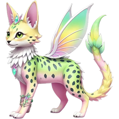 Epic complex knightly divine glorious futuristic detailed dark dusky gloomy pastel pink-pastel-green-pastel-yellow-white-gradient-iridescent, realistic Fakémon-Sprigatito-Floragato-Meowscarada-Trico-Sergal-Serval-Vernid-creature (full body) with bracelets and anklets and fairy wings emoji
