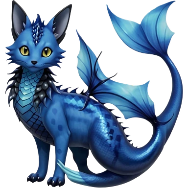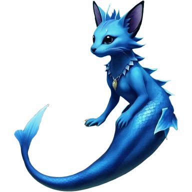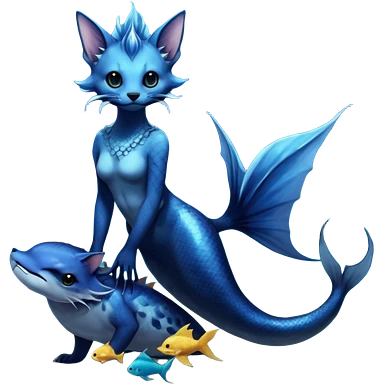 Epic complex abyssal fantasy divine glorious detailed dark dusky gloomy deep gothic gloomy cobalt-blue-abyss-blue-black-greyish, realistic Fakémon-Sprigatito-Floragato-Meowscarada-Vaporeon-Salandit-Trico-Sergal-Serval-Vernid-creature (full body) with mermaid-ears, tail fin, shiny sparkly, abyssal emoji