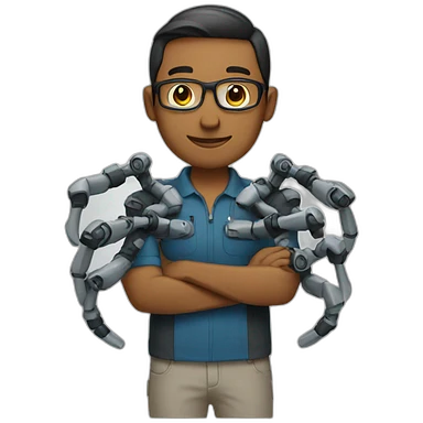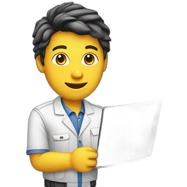 male virtual assistant with a smiling holding a digital tablet or stylus wearing eye glasses and white shirt black hair emoji