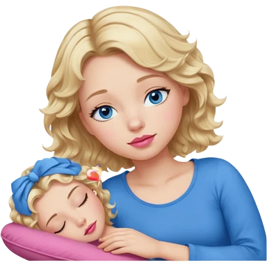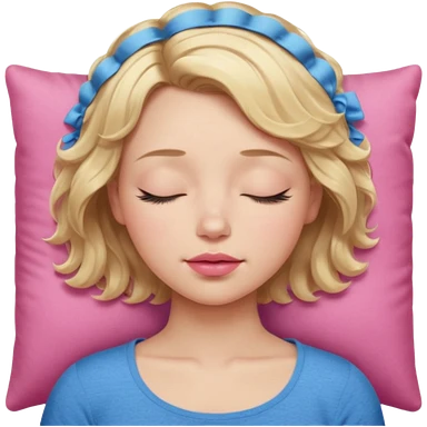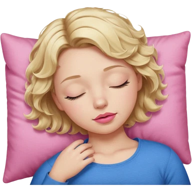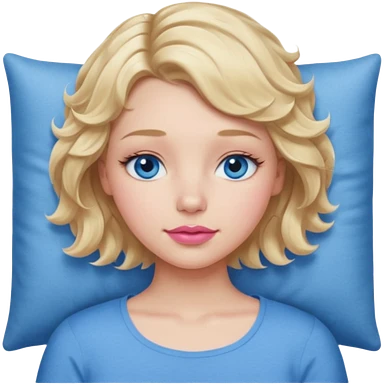 Girl Blonde short wavy hair, blue eyes, cute blue top, long lashes, pink lips, sleeping emoji