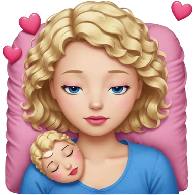 Girl Blonde short wavy hair, blue eyes, cute blue top, long lashes, pink lips, sleeping eyes closed, hearts emoji