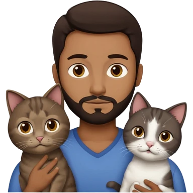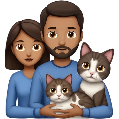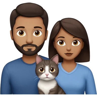 Make a couple and a cat emoji. The first person is a man with dark brown hair and a beard that’s not to long. The other person is a woman with even darker brown hair and is a little brown skinned but not much. The cat is 15weeks so little and grey and white with a little brown on her face and chest emoji