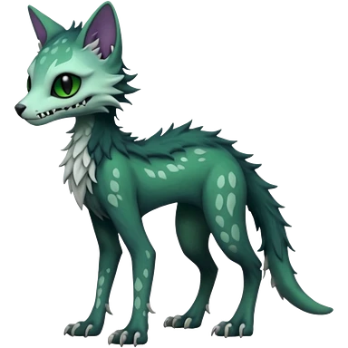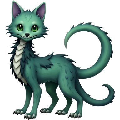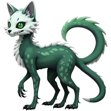 Scaley Kawaii spectral spooky dark bleak blackish swampy white-skeletal gloomy ghostly dark greyish dark-deep-greenish foggy eldritch beautiful realistic edgy fantasy ghoul-like stitched feline-vernid-sergal-fursona animal creature with a tufted tail full body with intricate markings emoji