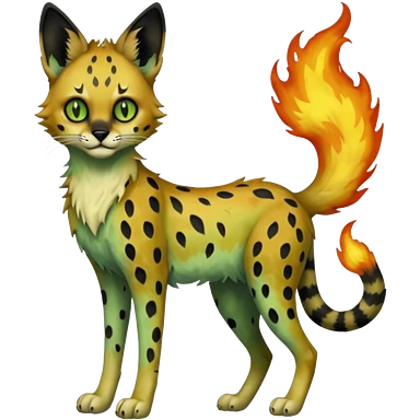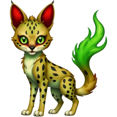 Dark-deep-blackish-Greenish Zombie-serval, full body, with green spectral haunted flames, big white claws, slit pupils, big red eyes, emoji