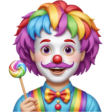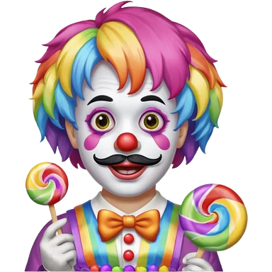 Funny clown — rainbow wig, mustache, candy in hand emoji