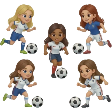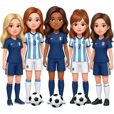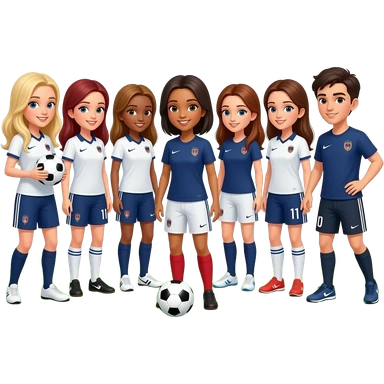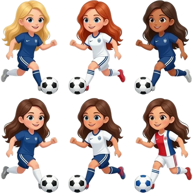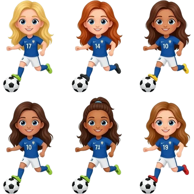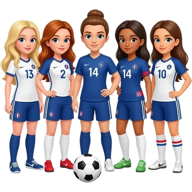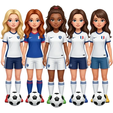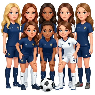 A team of 7 women playing soccer in France : one long blond hair white skin, one auburn long hair white skin, one with caramel-colored skin and chestnut hair, two with chestnut long hair white skin, one with brown middle hair white skin, one with brown long hair white skin emoji
