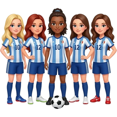 A team of 7 women playing soccer in France : one long blond hair and white skin, one auburn long hair and white skin, one with caramel-colored skin and chestnut hair, two with chestnut long hair and white skin, one with brown middle hair and white skin, one with brown long hair and white skin emoji