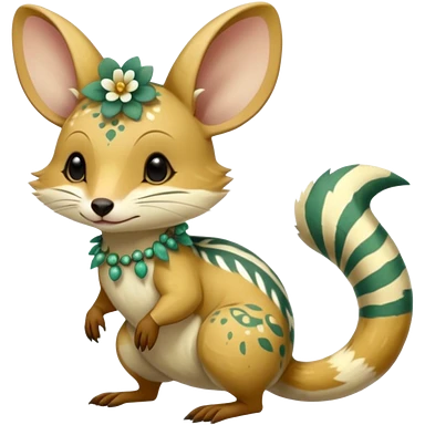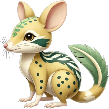 Tropical Exotic Colorful Beige-yellow, Jade-green, white specks, Floral Feathery Numbat-Bilby-Quoll-Furret-Fakémon-furry-fursona-creature (full body) with tribal markings emoji