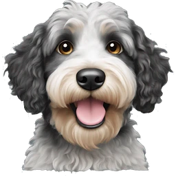 White and gray Aussiedoodle with blue eyes holding coffee emoji