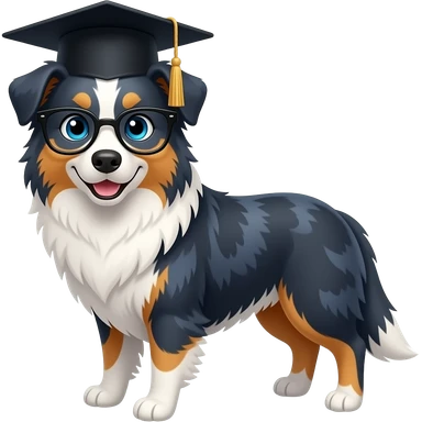 australian sheperd merle bleu, blue eyes, wearing nerd glasses and student gratuate hat emoji