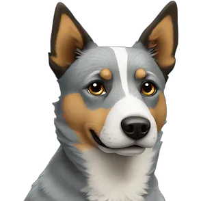 A cute, slightly 3D emoji-style digital illustration of a Blue Heeler (Australian Cattle Dog) from the neck up, with a focus on its face and upper neck. The dog has a black and gray speckled coat with short, dense fur. It has large, pointed ears that stand upright, with the inner part of the ears being a soft pinkish hue. The face is expressive, with warm brown eyes—one eye slightly lazy—giving it a friendly and curious look. The dog’s snout is medium-sized, with a black nose and subtle whisker markings. The expression is neutral but slightly inquisitive. The fur texture should be smooth and well-blended to maintain a polished emoji-style appearance. The illustration should have smooth shading, a rounded, polished look, and a slightly three-dimensional feel. No black spots on the fur. No background. emoji