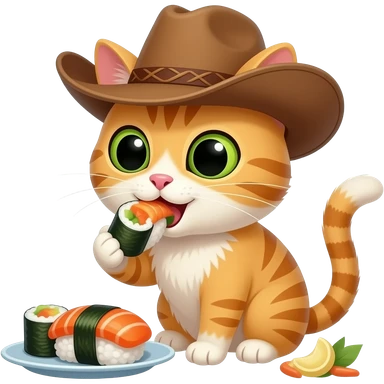 a cat eating sushi wearing a cowboy hat emoji