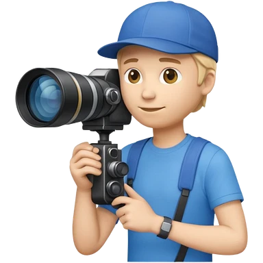 3D emoji-style icon of a photographer in side profile, wearing a blue cap backwards and a blue t-shirt, holding a professional camera with a long telephoto lens emoji