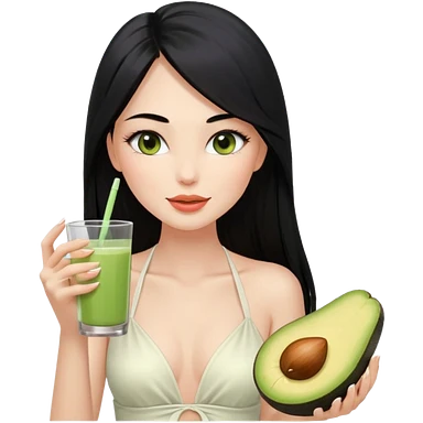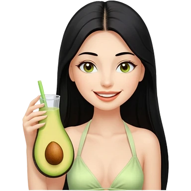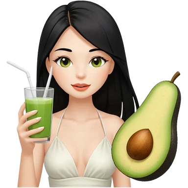Long black hair with no bangs, very straight hair, pretty face. Wearing white plain halter top. Blushed cheeks, long lashes, nude glossy lips. One eyes with wink. One hand with avocado juice. emoji