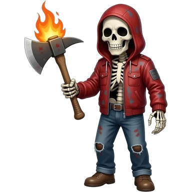 make me scary skeleton with red old and dirty jacket with hood and let him hold fire axe emoji