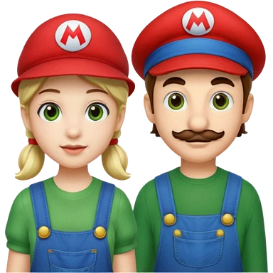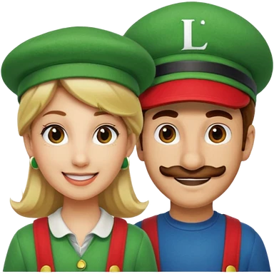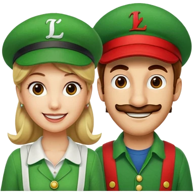 blonde female Luigi (with the Luigi green hat with an L on it) and a normal brown hair male Mario with the red hat with a M on it. They are friends just smiling emoji