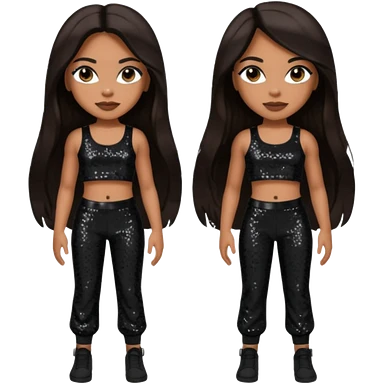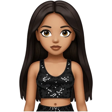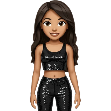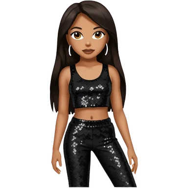 Aaliyah with black sequin crop top and pants, long dark brown hair emoji
