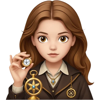 Barbara Palvin as Hermione Granger with brown eyes and holding a time turner emoji
