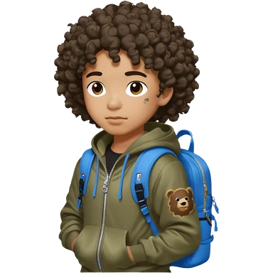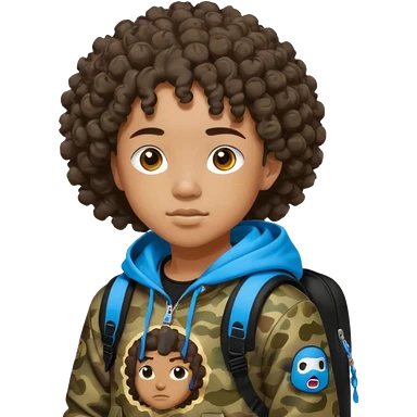 blasian teenager with curly hair, andbape hoodie and sprayground backpack emoji