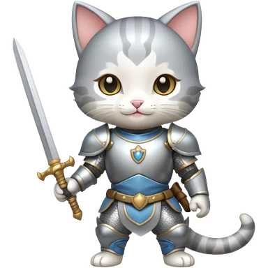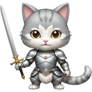 baby chibi cat in silver armor, full body, smile, hold sword emoji