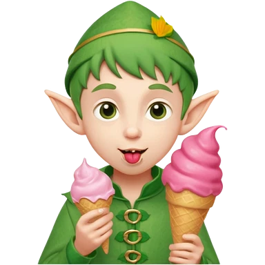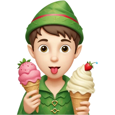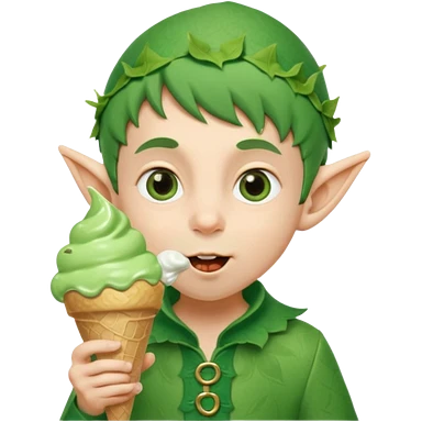 A young elf boy in leafy clothes licking a triple-scoop ice cream with wide eyes. baby elf with strawberry ice cream emoji