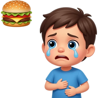 kid sad but not crying holding tummy hungry with bubble at the top with burger emoji