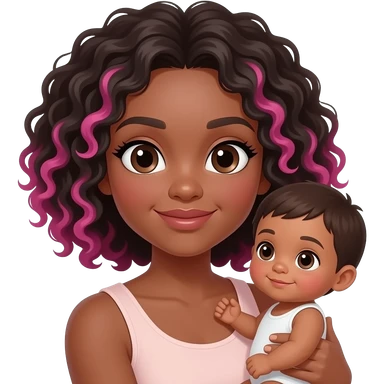 Curly hair with pink highlights, woman with brown skin holding baby with light brown skin straight hair, big eyes emoji