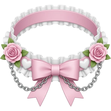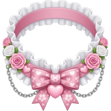 Pastel-baby-rose-pink Lolita-styled aesthetic cute kawaii choker-collar-necklace adorned with with white frills, roses, hearts, bow tie, silver chains, sakura, apparel separated emoji