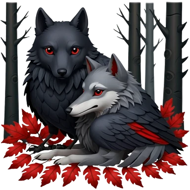 A raven bird and a wolf laying together with Weirwood leaves beneath them emoji