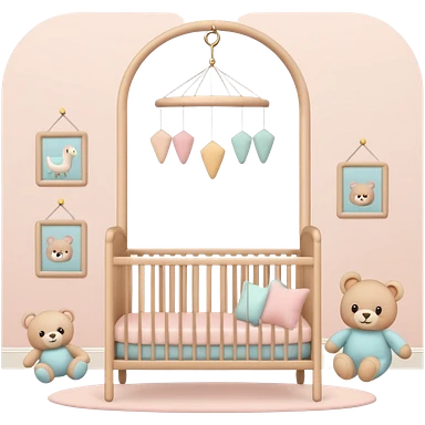 pastel baby nursery items including crib, mobile, and plush toys emoji