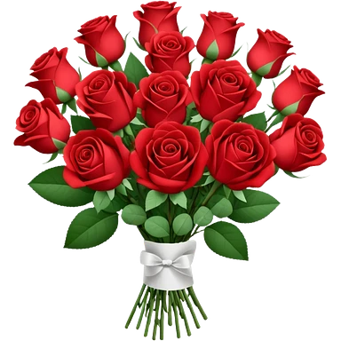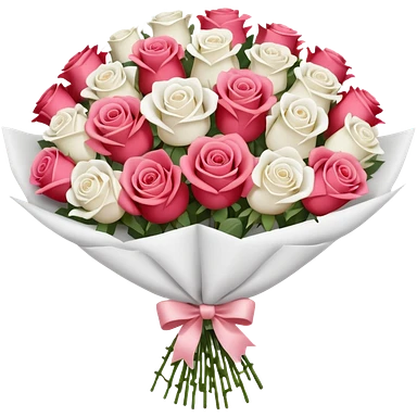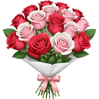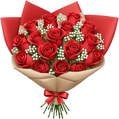 A paper-wrapped bouquet of fresh roses and baby’s breath emoji