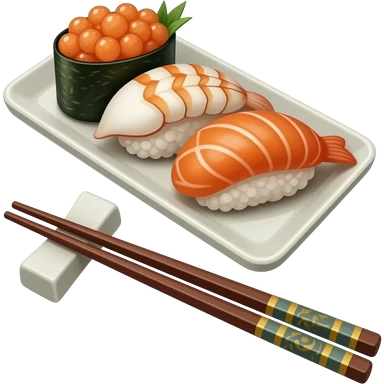 un plateau de sushi avec des baguettes chinoises. La vue est en 3/4 Ajoute subtilité pour renforcer l'impression de luxe de la scène. L'ensemble est isolée sur un fond blanc. emoji