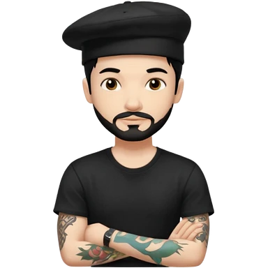 White guy with black hat back with little facial hair and black t shirt with tattoos emoji