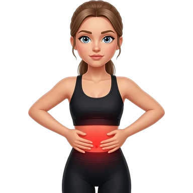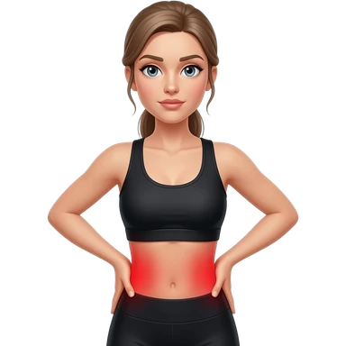back pain, anatomical highlight of the full spine and back muscles, full red glow over the entire back area, woman with hands on lower back, fair-skinned woman, gray-blue eyes, ash brown brows, ash light brown hair tied back, slim athletic body, black workout set emoji | AI Emoji Generator