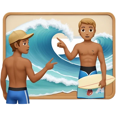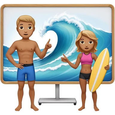 icon of a surf instructor teaching, pointing to a whiteboard with a wave in the center. Below the board are two avatars with their backs turned, looking at the board. emoji