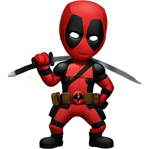 Deadpool in classic red and black suit, holding katanas, playful expression emoji