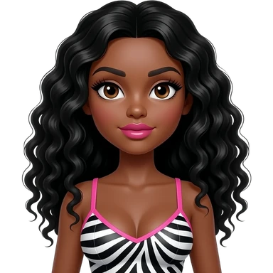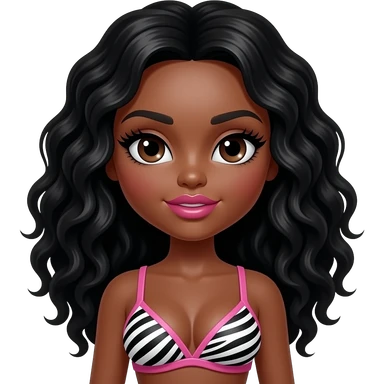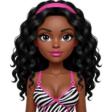Baddie lashes, dark brown, doll eyes, doll body, Black girl, dark brown skin with long curly black hair, black eyebrows, doll eyes, with giant breast, giant pink lips, plastic surgery, zebra print with pink straps emoji